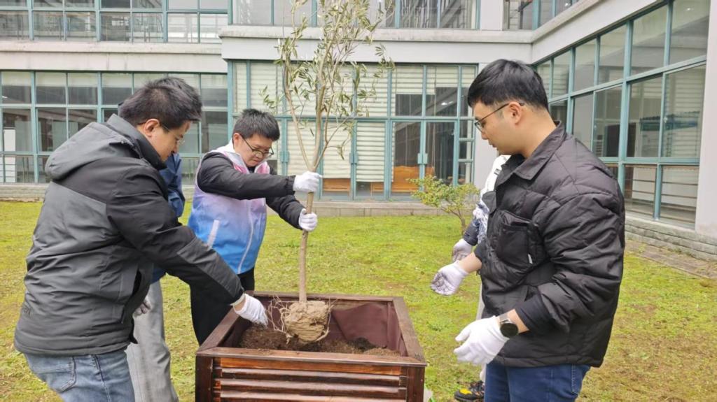 栽植环节,师生们分工协作、挥锹培土、扶苗浇水,亲手将10棵橄榄树苗植入沃土,共同打造学院特色“橄榄林”文化景观。大家在躬身劳作中体悟劳动之美,在栽培养护中传递责任担当,为校园添上一抹生机盎然的橄榄绿。